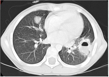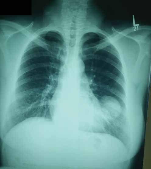 Hình 6.Chụp X-quang phổi thông thường cho thấy có  một vùng sáng tròn rõ ràngnằm ở vùng thấp bên trái của phổi.