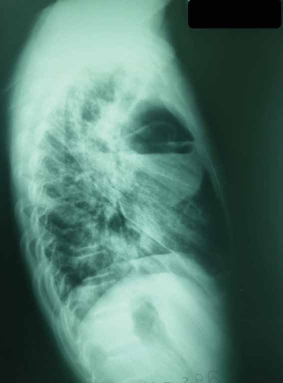 |   Hình 7.Hình ảnhX-quang ngực nghiêng cho thấy mức dịch khí bên trong một nang sán đã tồn tại từ trước gợi ý  nhiễm trùng chồng lấn.