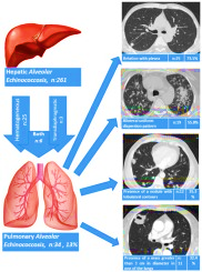 Các loài phổ biến nhất liên quan đến bệnh sán lá phổi là Paragonimus westermani, P. miyazakii, P. mexicanus và P. skrjabini. Sau khi bị nuốt vào cơ thể, ký sinh trùng sán lá phổi trưởng thành đi qua nhiều cơ quan hoặc mô và sau đó đến các mô phổi từ ruột non. Bệnh sán lá phổi có thể liên quan đến các tổn thương dạng nang và các nốt sần và 20% bệnh nhân có thể có các tổn thương do sán lá phổi không triệu chứng. Tràn dịch màng phổi đã được mô tả cụ thể với bệnh sán lá phổi và được báo cáo ở 40-70% bệnh nhân và có liên quan đến tăng BCAT. Tuy nhiên, bệnh sán lá phổi cũng có thể gây ra các nốt, thâm nhiễm và các khoang rỗng (Hình 4).