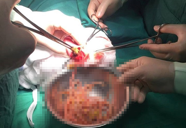 BS Trung cho biết, trong quá trình mổ, phát hiện các quai ruột của bệnh nhi đã bị giãn to, ổ bụng nhiều dịch đục. Đoạn hồi tràng dài 40cm chứa đầy giun gây tắc ruột, có đoạn đã bị rách thanh mạc. Các bác sĩ đã mở hồi tràng lấy ra một số lượng lớn giun đũa đang sống (bỏ đầy bình dung tích khoảng 1,5 lít). Sau mổ, trẻ đang được theo dõi hồi sức do tình trạng nhiễm khuẩn nhiễm độc còn nặng nề.