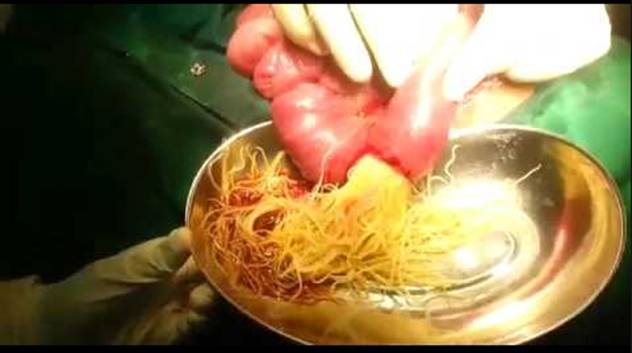Các bác sĩ gắp ra búi giun từ ruột bệnh nhi nữ