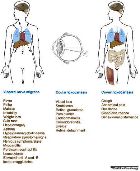 Một số nhỏ ấu trùng thường không gây bệnh. Hầu hết ca VLMs không biểu hiện triệu chứng và được nhận ra chủ yếu khi có tăng bạch cầu ái toan tăng tồn tại.