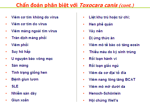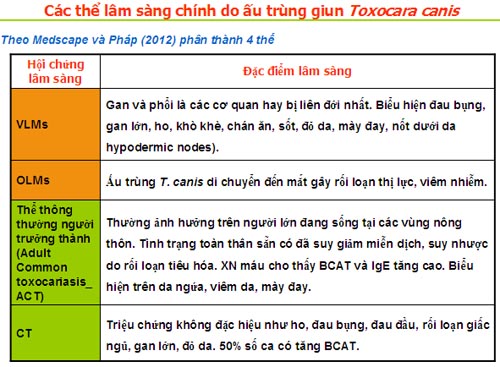 Một nghiên cứu khác (Stensvold CR và cs., 2011) đang công tác tại khoa vi ký sinh, viện Statens, Đan Mạch cho biết biểu hiện lâm sàng của bệnh ấu trùng giun đũa chó mèo – một căn bệnh ký sinh trùng lây truyền từ động vật sang người từ chó và mèo đến người, có thể là rất đa dạng và một trong những lý do này là tại sao bệnh liên quan đến Toxocara có thể không đươc lưu ý. Bài báo này đã tóm tắt các biểu hiện lâm sàng khác nhau của cả ba thể của bệnh là (CT, VLMs và OLMs), trong đó đặc biệt chú ý đến bệnh ấu trùng ở cơ quan thần kinh. Chẩn đoán và chẩn đoán phân biệt cũng như khâu điều trị và dự phòng. Nhìn chung, chẩn đoán bệnh ấu trùng giun đũa chó ở người dựa vào các dữ liệu trên bệnh nhân, các thông tin về bệnh sử (anamnestic information), trieuj chứng, tăng bạch cầu ái toan và tính nồng độ IgE tổng thể.
