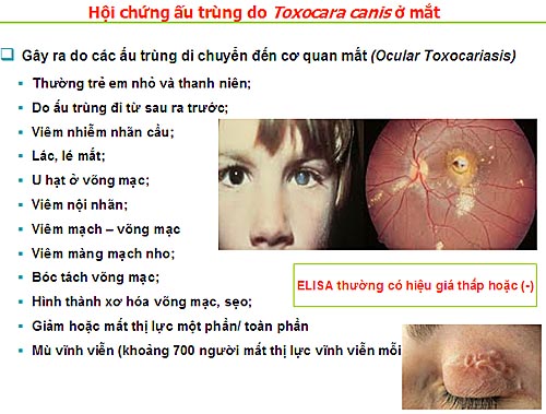 Thể mắt hội chứng OLMs có thể gây ra một phổ lâm sàng trên bệnh lý mắt, gồm có dạng u hạt võng mạc (retinal granulomas), bóc tách võng mạc (retinal detachment), viêm mống mắt, viêm thần kinh nhãn cầu (optic neuritis), viêm kết mạc (keratitis), viêm nôi mạc nhãn cầu, abcesthủy tinh thể và hypopyon. Nhiễm trùng thường diễn ra một bên mắt và chỉ có duy nhất một ấu trùng chịu trách nhiệm cho các triệu chứng này.