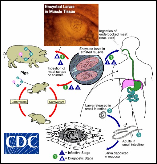 Nhiễm giun xoắn ở người thường khởi đầu do ăn thịt heo, gấu, con móc (giống như loài chó biển), thịt ngựa hoặc thịt từ các động vật có vú nấu chưa chín nên còn chứa các ấu trùng giai đoạn nhiễm của Trichinella còn sống sót. Mô cơ thể bị nhiễm đầu tiên là mô của vùng cơ dạ dày, ấu trùng thoát kén rồi xâm nhập vào niêm mạc ruột non, phát triển thành giai đoạn ấu trùng, trưởng thành rồi giao phối vào ngày thứ 2. Đến ngày thứ 6 sau nhiễm, giun cái bắt đầu phóng thích ấu trùng di động để đi đến hệ thống bạch huyết của ruột non hoặc vi mạch nhỏ ở mạc treo tràng; tiếp đến là vào cơ vân (ở đó khoảng 4 tuần, mỗi con cái đẻ ra khoảng 1.500 ấu trùng trong vật chủ không có miễn dịch).
