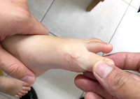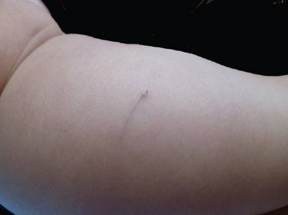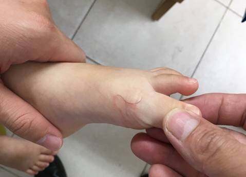 -Theo mẹ bé cho biết cách đây 2 tuần, trên da mặt trên bàn chân của cháu có một đường màu đỏ, ngắn sau đó dài dần và ngoằn ngoèo.