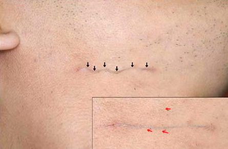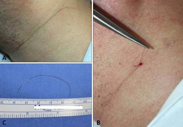 Hình 1. Sang thương và đường di chuyển ở dưới da do sợi tóc
