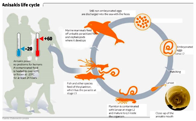 Hình 9. Mặc dù không tác động nghiêm trọng nào trên sức khỏe con người, song khi nhiễm có thể thúc đẩy phản ứng dị ứng trên cơ thể. Nếu ấu trùng Anisakid còn sống, dẫn đến các triệu chứng tiêu hóa nhẹ, thậm chí loét. Loại bỏ ấu trùng có thể thông qua nấu ở nhiệt độ 60ºC trong 1 phút hoặc để trong điều kiện -20ºC trong 5 ngày. Nguồn: https://mag.hookandnet.com/