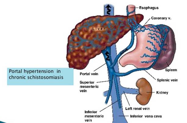 -Tăng áp lực tĩnh mạch cửa với biểu hiện triệu chứng nôn ra máu và lách lớn (chủ yếu do hai loài S. mansoni, S. japonicum);