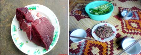 Thịt bò trước và sau khi băm nhỏ chế biến để ăn sống và uống với rượu |