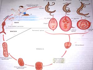 - Chu kỳ của sán máng: Sán máng ký sinh ở các nhánh mạc treo của hệ tĩnh mạch gánh, lách, bàng quang. Trong khi cuộn với nhau, con cái giao hợp với con đực, sau đó con cái rời bỏ con đực đi ngược chiều máu chảy tới những huyết quản nhỏ để đẻ trứng. Số lượng trứng không nhiều nhưng có gai, những gai này làm rách niêm mạc vi quản để ra nước phát triển thành trùng lông, trùng lông bơi trong nước để tìm đến vật chủ trung gian là ốc để phát triển thành trùng đuôi. Trùng đuôi rời khỏi ốc bơi trong nước, trùng đuôi có đuôi xẻ đôi; khi người bơi lội hoặc tắm, trùng đuôi sẽ xâm nhập vào người qua da. Sau khi chui qua da, trùng đuôi xâm nhập vào các mao mạch bạch huyết rồi theo tuần hoàn ruột rồi cư trú ở hệ tĩnh mạch cửa; sau khoảng 60 ngày trùng đuôi sẽ trở thành sán trưởng thành.