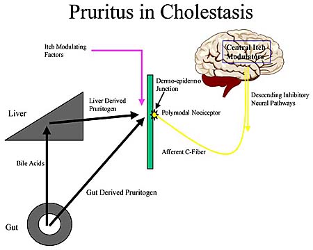 ·Ngứa. Ngứa và kích thích là triệu chứng đầu tiên của hội chứng ứ mật và được nghĩ là do tương tác của các acide mật trong huyết thanh với các đầu mút sợi thần kinh (opioidergic nerves). Thực tế, các chất opioid agonist/antagonist Naltrexone được sử dụng để điều trị ngứa do tắc ứ mật;