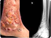 Hình 10. U nấm do Fusarium subglutinans. (a) Các tổn thương giống u trên vùng mắc cá bên (T) lùng nhùng, mềm và các vết hay đường hầm vỡ ra goài. (b) Một số vùng bị ly giải hủy hoại ở vùng xương chày, xương mác và xương gót.  |