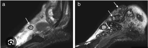 Hình 9. Sagital T1 (2A), Coronal T2 (2B): cho thấy các thay đổi viêm trên bàn chân trái với nhiều thương tổn nhỏ rải rác, thâm nhiễm mô mềm bàn chân và kéo dài lên đến xương. Tổn thương được mô tả như các thương tổn có tín hiệu cường độ cao và vòng tín hiệu kém ở ngoại vi và các chấm tín hiệu kém ở trung tâm (peripheral low-signal rim and low-signal dot in the center) được mô tả với tên gọi là chấm trong vòng tròn (“dot in circle” sign) (xem mũi tên đỏ). hình ảnh Coronal T1 sau bơm thuốc guadolinium (2C±2D) thấy tăng độ rõ nét của tổn thương và sự tồn tại các ổ tín hiệu kém, nhỏ được bao quanh bởi mô có cường độ tín hiệu thấp (mũi tên đỏ).  |