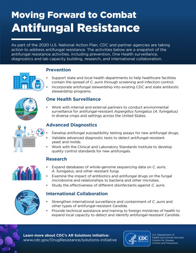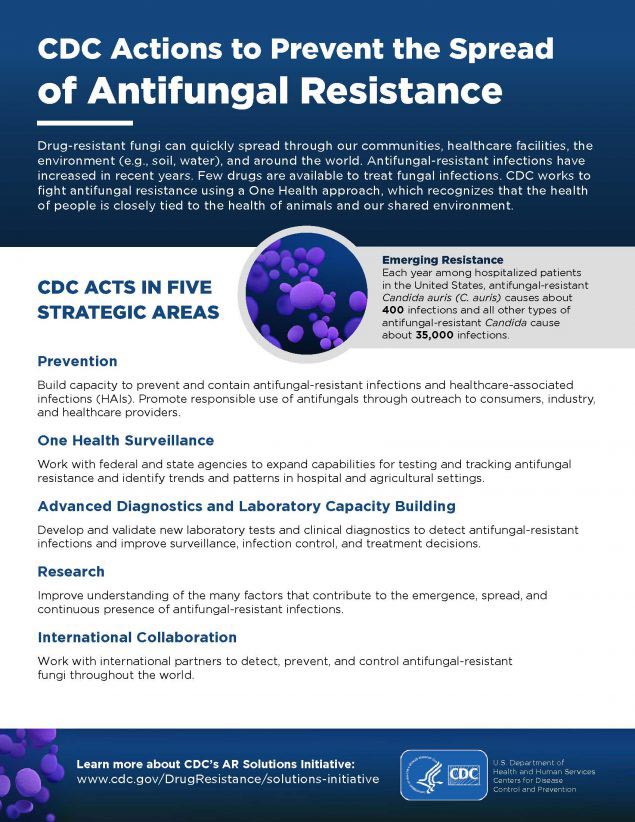 Nấm kháng thuốc đang phát triển như một vấn đề y tế công cộng, mọi người, bao gồm các nhà khoa học của US.CDC, chuyên gia y tế và nhân viên y tế công cộng đóng vai trò quan trọng trong vieẹc ngăn ngừa nhiễm nấm kháng thuốc. Các đầu tư vào công tác giám sát kháng thuốc của USCDC từ Sáng kiến giải pháp kháng thuốc do vi trùng nói chung (CDC’s Antimicrobial Resistance Solutions Initiative). Thông qua đầu tư này, USCDC chuyển thành hành động từng bước chống lại kháng thuốc. Trong số báo đặc biệt khoa học có tựa đề 'Sự trỗi dậy của tiến tình kháng thuốc', các chuyên gia quốc tế thảo luận về vấn đề này và các giải pháp khả thi đối với “quả bom hẹn giờ” kháng thuốc kháng sinh cũng như các tác nhân khác kháng thuốc như vi nấm và ký sinh trùng và virus cho biết tình trạng kháng thuốc kháng nấm có thể phát sinh thông qua các đột biến làm thay đổi cấu trúc/chức năng về số lượng protein mục tiêu của nấm hoặc nếu nấm có khả năng bơm chất chống nấm ra khỏi tế bào của nó.