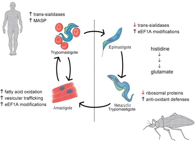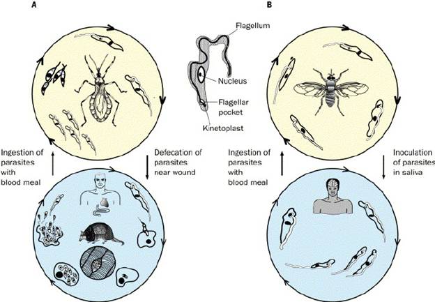 Các ký sinh trùng leishmaniform lớn hơn kéo dài dưới áp lực của mô, dẫn đến dài, mảnh mai. Các thể trypanosome trung gian và lớn, dưới sự thay đổi mô trường hóa học của máu vật chủ, chuyển dạng thành thể trypanosomes thoái lui và có thể tái xâm nhập vào các mô và thiết lập lại chu kỳ.