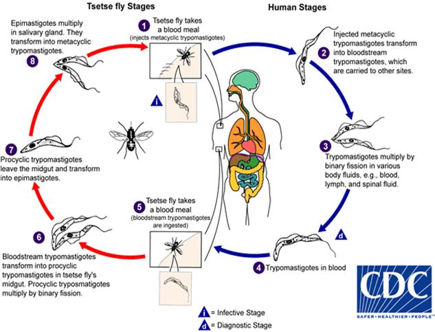 Thứ hai, GS. Michael Duszenko (Đại học Tübingen, Đức) và đồng nghiệp đã phát hiện rằng ngoài hai giai đoạn mà chúng ta đã biết, căn bệnh này thực tế có thêm một giai đoạn “bước đệm” giữa hai giai đoạn trên. Nghĩa là căn bệnh này có tổng cộng 3 giai đoạn gồm: Đơn bào xâm nhập vào máu của người bệnh thông qua vết cắn của ruồi mang mầm bệnh à Đơn bào xuất hiện trong dịch não tủy và 3 lớp màng bao bọc xung quanh não hay còn gọi là màng não à Đơn bào xuyên qua hàng rào máu-não và tấn công vào não bệnh nhân.