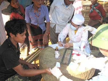 Xét nghiệm lam máu phát hiện bệnh sốt rét cho dân bản K’Lô, huyện K’Lưm, Lào (Ảnh: NVH) |