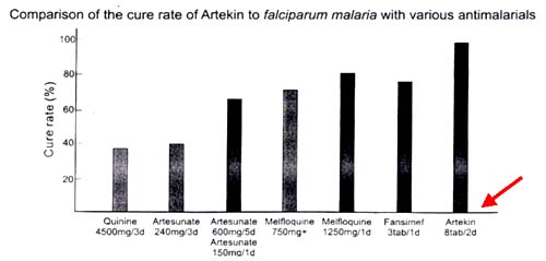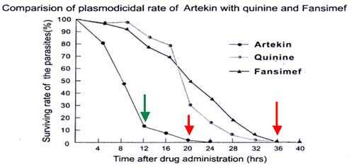 Nhìn vào biểu đồ trên, chúng ta có thể thấy được hiệu lực diệt ký sinh trùng của Artekin so với các thuốc sốt rét khác như Quinine và Fansimef khác nhau. Chỉ trong 12 giờ mà Artekin dường như giảm được lượng ký sinh trùng đến 90% và chưa đến 24 giờ sau, đã sạch 100%. Trong khi đó thuốc Fansimef (cũng là một thuốc phối hợp) và quinine đến giờ thứ 36 mới sạch ký sinh trùng .