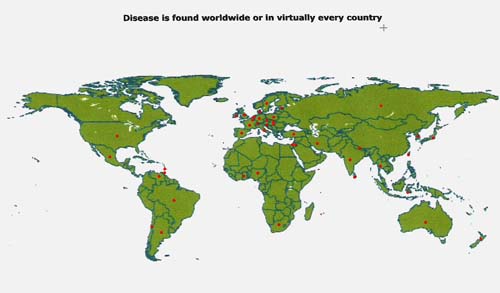 Bệnh giun đũa chó, mèo thường lưu hành khắp thế giới và có thể gây nên tăng bạch cầu ái toan đáng kể. Bệnh thường gây ra bởi nhiễm giun tròn chó (Toxocara canis), hoặc ít hơn là giun tròn của mèo (Toxocara cati). Trứng của T. canis đào thải bởi các chó con và có thể tìm thấy trong đất. Bệnh giun đũa chó mèo điển hình ảnh hưởng đến trẻ em nhỏ mà có thói quen thường ăn đất. Trên bệnh nhân này có 2 chó con và cô ta thường ăn đất vào mùa hè năm trước.