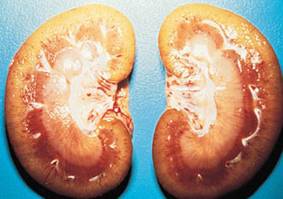Về bệnh tích, thể cấp tính có thể thương hàn (viêm dạ dày ruột xuất huyết, xuất huyết da và các niêm mạc, có thể gặp gan sưng, hạch bạch huyết xuất huyết); thể hoàng đản (da vàng ở bụng, gang bàn chân, lỡ tai, niêm mạc vàng, bàng quang chứa nhiều nước tiểu vàng sậm và có thể xuất huyết). Thể bán cấp hoặc mãn tính (gồm viêm thận kẻ hay viêm thận mãn tính, vết lở ở miệng và lưỡi có thể gặp trên chó có urea trong máu).