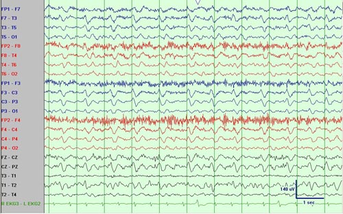 Điện não đồ (EEG) trên các bệnh nhân này có thể biểu hiện sóng delta, sóng ba phase và đôi khi có dạng sóng giả bị chặn đột ngột[10]. Trong một nghiên cứu, các sóng ba phase được xem là đặc tính của bệnh lý não gan được phát hiện trên 3 trong số 15 bệnh nhân viêm gan do sốt rét [7]. Vì các thử nghiệm trên điện não đồ không phải là đặc hiệu và được nhìn thấy trên chỉ một số lượng nhỏ bệnh nhân, nên có thể không được khuyên để thực hiện điều tra trên tất cả bệnh nhân nghi ngờ có bệnh lý gan do SR.