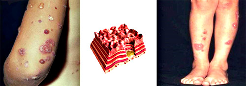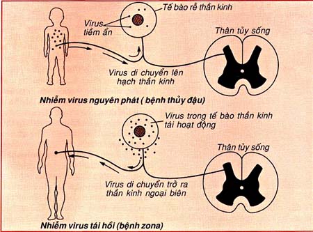 -Zona: biểu hiện tổn thương rất nhanh, nếu tính thời gian trong cả cuộc đời thì tỷ lệ bệnh có thể lên đến 20% dân số. Bệnh có thể xuất hiện ở bất cứ lứa tuổi nào nhưng tuổi càng cao thì tỷ lệ bệnh càng tăng, trẻ em cũng hay mắc bệnh zona, đa số bệnh nhân zona có tiền sử mắc bệnh thủy đậu từ bé, virus gây bệnh thủy đậu cùng loài với gây bệnh zona. Sau khi bệnh đã khỏi thì một số virus gây bệnh vẫn còn ở trạng thái tiềm ẩn không gây bệnh, nằm ở hạch thần kinh cảm giác và gây bệnh khi có điều kiện cơ thể suy yếu. Lúc đầu bệnh nhân thường bị đau và rát ở một vùng da. Cảm giác đau nhói tồn tại khoảng 1-3 ngày, sau đó nổi lên các mụn nước tập trung thành từng đám. Nếu không điều trị kịp thời sẽ tiến triển thành bọng nước; lúc đầu tổn thương chỉ là các đám nhỏ, phân bố rải rác thành một dải nếu không điều trị thì các mảng nhỏ này lan rộng ra và liên kếtvới nhau thành một mảng lớn, khu trú toàn bộ một vạt da theo một bên cơ thể: cả một vùng ngực hoặc một vùng mạng sườn...Thường thì các bọng nước chứa dịch trong, nhưng nếu có bội nhiễm kèm theo sẽ có mủ màu đục và bệnh nhân đôi lúc gây sốt nhẹ.