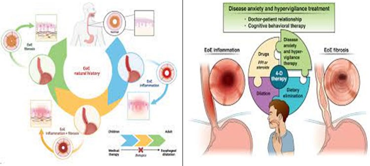 - Viêm mạn tính và thâm nhiễm BCAT ở thực quản dẫn đến lắng đọng mô tơ sợi dưới biểu mô (subepithelial fibrous tissue). Rối loạn chức năng và chỉnh sửa thực quản đồng thời. Vào giai đoạn cuối, bệnh có thể tiến triển chít hẹp thành thực quản, gây khó nuốt và sinh ra tắc nghẽn thức ăn;
