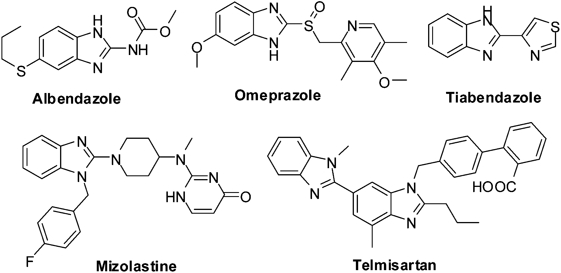 Nhân benzimidazole có vai trò quan trọng trong ngành dược học, các dẫn xuất thay thế benzimidazole có vai trò trong nhiều phác đồ không những áp dụng để điều trị trong các bệnh viêm loét dạ dày-ruột, điều trị một số bệnh ký sinh trùng giun sán, mà còn dùng để điều trị tăng huyết áp, chống đông, chống dị ứng, giảm đau, kháng viêm, hạ sốt, kháng nấm, kháng vi khuẩn, kháng virus, chống oxy hóa, chống ung thư và chống lo âu. Do đó, với vai trò quan trọng rõ ràng, các dẫn xuất của benzimidazole đã được phát hiện có tiềm năng tác dụng trong điều trị nhiều bệnh lý khác nhau, trong đó hiệu quả rõ ràng trên hệ tiêu hóa và hệ tim mạch với nhiều tác dụng khác nhau nhưng chưa được hiểu thấu đáo.Benzimidazole là những chất đóng vai trò trung tâm để phát triển các phân tử có lợi điểm về mặt dược và sinh học. Các dẫn chất thay thế của benzimidazole có nhiều ứng dụng đa dạng trong điều trị nhiều bệnh lý khác nhau trên lâm sàng và nay nhóm thuốc benzimidazole được liệt kê vào danh sách thuốc có nhiều tác động khác nhau. Về cấu trúc, benzimidazoles có nhiều cấu trúc khác nhau tùy thuộc vào thay đổi gốc trong công thức hợp chất và tổng hợp.