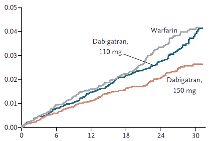 ở các nhóm warfarin, dabigatran 110 mg và dabigatran 150 mg trong nghiên cứu RE-LY.
