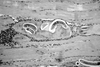 Một phụ nữ 37 tuổi từ Bangladesh cho biết có tiền tử trong 3 năm qua xuất hiện dấu sưng phồng từng đợt ở cánh tay (P) đến phần giữa của cơ nhị đầu, kèm theo có ngứa, đau cơ và đau khớp. Triệu chứng khởi đầu xảy ra khi cô ta đi thăm quan khăp Bangladesh, ăn thịt cừu, cá và gà. Đếm bạch cầu ái toan là4.37 x 109/L và bệnh nhân được chuyển từ khoa khớp đến khoa nhiệt đới. Sau 21 ngày điều trị albendazole, bạch cầu eosin giảm xuống còn 1.12 x 109/L; triệu chứng tái phát vài tháng sau đó, sau khi điều trị liệu trình thứ 2 bằng albendazole (400mg hai lần mỗi ngày x 21 ngày), triệu chứng bệnh được giải quyết và eosin trở về trị số bình thường (0.25 x 109/L).