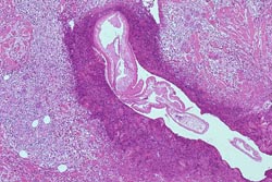 Về mô học trên mẩu sinh thiết da, thân giun bị cắt ngangđược nhận ranhờ lớp biểu bì có gai, cấu trúc thực quản và ruột . Trên đường di chuyển của ấu trùng có hiện tượng phù , xuất huyết, thâm nhiễm bạch cầu toan tính, tế bào lym phô và tương bào khi ấu trùng cố định ở một chổ thì chổ đó xảy ra hiện tượng viêm mạnh tới sự hoại tử mô và tế bào khổng lồ.