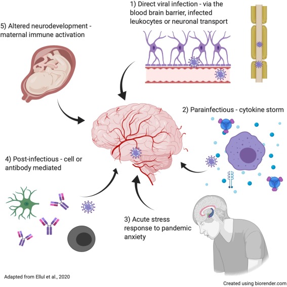 Hình 4. Rối loạn chức năng não bộ do virus SARS-CoV-2 gồm có: nhiễm trùng nhu mô não (hiếm),