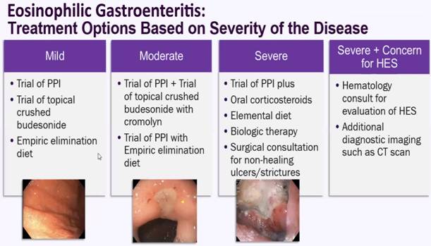 Các thuốc giúp giảm nhẹ triệu chứng EoG nhưng không chữa khỏi nó. Thuốc hay thay đổi chế độ ăn sẽ cần tùy theo thời gian mắc của trẻ em. Đôi khi cần phải có mẫu sinh thiết để kiểm tra EoG và tìm kiếm chế độ điều trị.