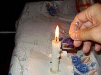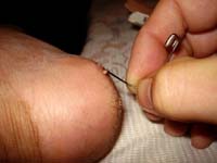 Lỗ vào của ký sinh trùng đang mưng mủ | Dùng cây nến để sát trùng và làm âm vết thương | Dùng kim băng khêu lỗ đường vào của KST |