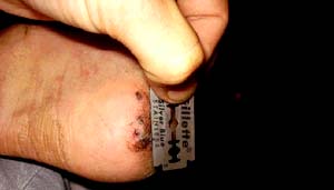 Dùng kim băng gỉ sét chuẩn bị phá lỗ vết thươg đang mưng mủ | Nặn mủ không vô trùng | Kim băng khều ký sinh trùng ra ngoài |