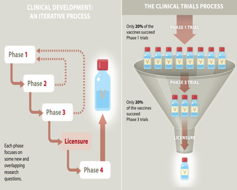 Một loạt thử nghiệm lâm sàng đầy đủ dành cho một ứng viên vắc xin thành công có thể mất từ 10 đến 12 năm, có sự tham gia của 50.000 đến 100.000 tình nguyện viên và tiêu tốn từ 500 triệu USD trở lên. Rất ít loại vắc xin có thể tồn tại được trong quá trình nghiêm ngặt này, đó là một lý do khiến hoạt động nghiên cứu và phát triển dược phẩm (R&D) rất tốn kém. Việc tạo ra vắc-xin sốt rét cho trẻ nhỏ và phụ nữ mang thai-một trong những thách thức phát triển vắc-xin quan trọng nhất hiện nay-cũng không phải là ngoại lệ. Tuy nhiên, các nhà phát triển vắc xin sốt rét tin tưởng rằng mục tiêu sẽ đạt được và đã nhìn thấy những kết quả đầy hứa hẹn.