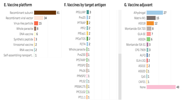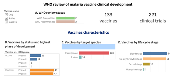 Theo phân tích của WHO, trong số 38 loại vắc xin đang ở trạng thái "hoạt động" đang phát triển lâm sàng thì hơn một nửa (22; 58%) ở giai đoạn I, một phần ba (14; 37%) ở giai đoạn II, một ở giai đoạn III và một (RTS,S/AS01E) ở giai đoạn IV (biểu đồ B).87% (33 vắc xin) có mục tiêu cho Plasmodium falciparum và 13% (5 vắc xin) có mục tiêu cho Plasmodium vivax(biểu đồ C).Khoảng một nửa (17; 45%) nhắm đến giai đoạn tiền hồng cầu, tiếp theo là giai đoạn máu (15; 40%) và giai đoạn hữa tính (9; 24%) (biểu đồ D).Hai phần ba là vắc xin tiểu đơn vị tái tổ hợp (25; 66%). Tiếp theo là các hạt giống vi rút (7; 18%) và nền tảng vắc xin tái tổ hợp có vectơ vi rút (5; 13%) (biểu đồ E).17 loại kháng nguyên khác nhau đã được nhắm mục tiêu, trong đó PfCSP là phổ biến nhất (13; 34%) (biểu đồ F).Trong số chín tá dược khác nhau được sử dụng, hai tá dược được sử dụng trong hai loại vắc xin được WHO khuyến nghị là AS01E (RTS,S) và Matrix M1 (R21).