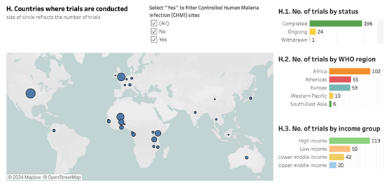Tổng cộng có 221 thử nghiệm vắc xin sốt rét đã được hoàn thành hoặc bắt đầu kể từ năm 2002, trong đó24 thử nghiệm đang diễn ra đối với vắc xin đang được phát triển tích cực.Các thử nghiệm lâm sàng hiện nay đang được thử nghiệm ở rất nhiều các khu vực khác nhau trên thế giới, bao gồm Châu Phi, Châu Mỹ, Châu Âu, Tây Thái Bình Dương và Đông Nam Á. Trong đó gần một nửa (102; 46%) đã được hoàn thành hoặc đang diễn ra tại 13 quốc gia trong khu vực Châu Phi của WHO (biểu đồ H).