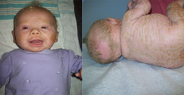 Trước đây, những bé Harlequin hiếm khi sống sót trong những ngày đầu sau sinh. Tuy nhiên, hiện nay với những tiến bộ trong chăm sóc sơ sinh, những bé mắc bệnh này có thể được cứu sống. Những bé sống sót phát triển thể chất có thể bị chậm do năng lượng cần thiết khổng lồ cho chức năng đòi hỏi của lớp da bé, nhưng sự phát triển về tâm thần và trí thông minh đa số là bình thường. Bệnh này do rối loạn di truyền gen lặn, nghĩa là nhận hai gen lặn, một từ cha và một từ người mẹ, nhưng người cha không có biểu hiện triệu chứng bên ngoài.