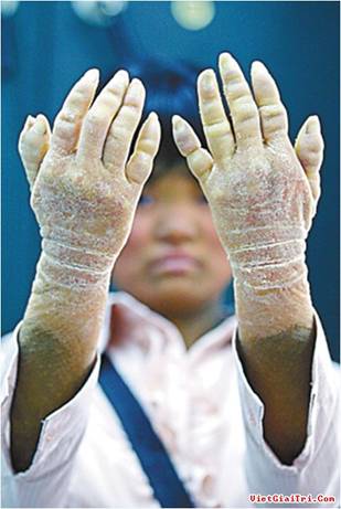 Một cậu bé Trung Quốc có làn da đen sạm với những mảng khô, tróc như vảy cá.Đôi tay của một cậu bé mắc bệnh da vảy cá (Ảnh minh họa)