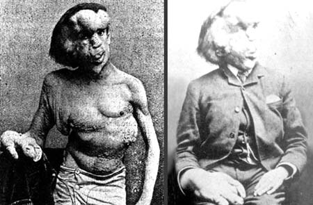 Có lẽ người được biết đến nhiều nhất trong danh sách này là Joseph Merrick , hay Elephant Man. Sinh năm 1836, người đàn ông quốc tịch Anh này đã trở thành một người nổi tiếng ở London cũng như trên toàn thế giới. Ông sinh ra với hội chứng Proteus - một căn bệnh gây ra khối u rất lớn phát triển trên da khiến xương biến dạng và teo nhỏ. Mẹ Joseph qua đời khi ông được mười một tuổi, không chỉ vậy ông còn bị người cha mình chối bỏ. Ông bỏ nhà đi từ khi còn rất trẻ và làm việc tại Leicester trước khi liên hệ với một ông bầu và trở thành diễn viên chính sau đó. Ông xuất hiện trên sân khấu với cái tên 'Elephant Man'. Joseph luôn phải ngủ ngồi do đầu của ông quá nặng.