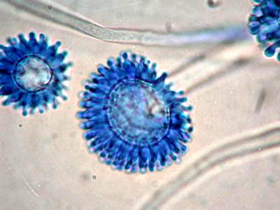 - Phương pháp giải phẩu bệnh thực hiện bằng cách sinh thiết mô bị tổn thương, nhuộm hemotoxylin, gomori methamine silver (GMS), periodic acid schiff (PAS)... thấy các sợi nấm chia nhánh thành hai, tạo góc 45o, đường kinh từ 2 đến 5 µm; đôi khi thấy các tế bào nấm hình tròn hoặc hình ovale ở đầu hoặc giữa sợi nấm, chúng có thể đứng đơn độc, kích thước từ 4 đến 10 µm do các bào tử nấm phồng lên, có thể thấy bào đài, tiểu bào đài...