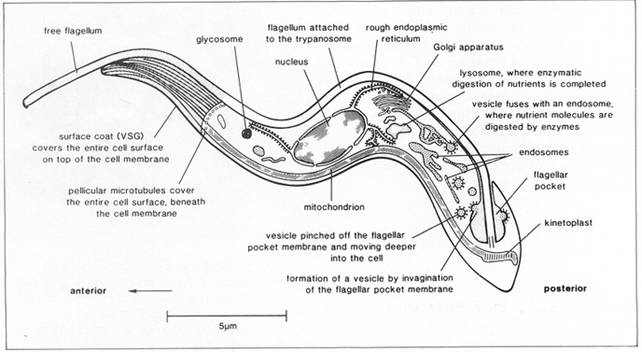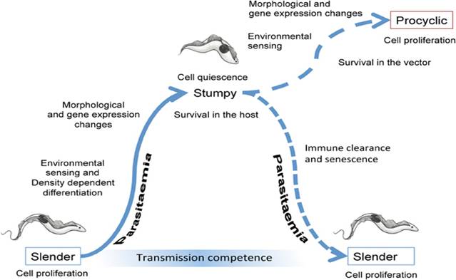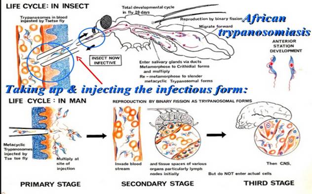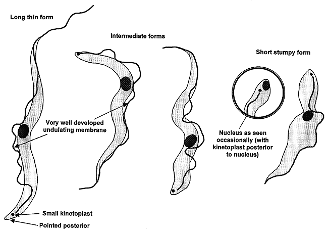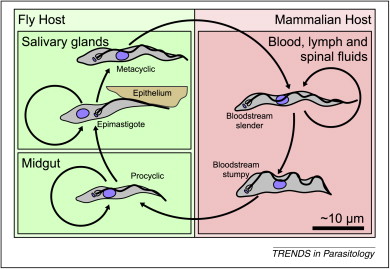 Trypanosome (còn gọi là trùng mũi khoan) là những ký sinh trùng có chu kỳ gồm 2 vật chủ: động vật có vú và các loài chân khớp. Chu kỳ sinh trưởng bắt đầu khi các trypanosomes bị tiêu hóa trong bữa ăn máu của các con ruồi tsetse từ một ổ chứa là người bị bệnh West African trypanosomiasis hoặc của động vật bị thể Đông Phi. Các trypanosomes nhân lên qua một thời gian 2-3 tuần trong ruột của ruồi; tiếp đến các trypanosomes di chuyển đến các tuyến nước bọt, ở đó chúng phát triển thành thể trưởng thành epimastigotes. Các metacyclic trypomastigotes nhiễm lên người sau đó. Ổ chứa bệnh đối với các vector này là dành riêng cho người với bệnh trypanosomiasis Tây phi (West African). Tuy nhiên, bệnh Trypanosomiasis Đông phi (East African) lại là bệnh lây truyền từ động vật sang người với các vector là các động vật. Bệnh trypanosomiasis châu Phi (African) khác với bệnh trypanosomiasis của châu Mỹ (American), gây ra bởi Trypanosoma cruzi và có những điểm khác về vector, đặc điểm lâm sàng và liệu pháp điều trị.