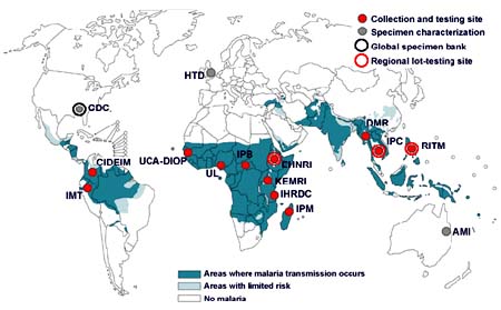 Việc thực hiện khâu kiểm tra các sản phẩm này do sự phối hợp của WHO, FIND và các đại diện từ các vùng khác nhau trên thế giới. Chất liệu chuẩn được thiết kế do Viện Nghiên cứu y học nhiệt đới ở Philippines, Viện Pasteur ở Cambodia, Viện nghiên cứu y học Kenya, Đại học Cayetano Heredia ở Peru, đại học Lagos ở Nigeria, Viện Pasteur ở Cộng hòa Trung Phi, Viện Pasteur ở Madagascar, Đơn vị Nghiên cứu y học Myanmar, Trung tâm nghiên cứu y học và phát triển ởTanzania và Trung tâm Điều tra về môi trường và y tế quốc tế Colombia. Các đặc điểm di truyền của ký sinh trùng đã được tiến hành tại Viện nghiên cứu y học Queensland và đặc điểm ký sinh trùng tại bệnh viện nhiệt đới ở London. Việc xác định loài và kiểm tra sản phẩm được tiến hành ở Trung tâm phòng chống bệnh tật Atlanta, Mỹ.