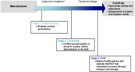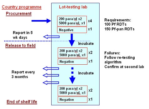 Thực hành tốt test chẩn đoán nhanh trong một thử nghiệm sản phẩm đối chứng sẽ không bảo đảm cho các sản phẩm khác rút thăm ngẫu nhiên, một khi vận chuyển đến các quốc gia định áp dụng test cũng như sẽ thực hiện. Không phải hiếm, các quốc gia đã mua các sản phẩm rút thăm ngẫu nhiên sử dụng kém hoặc đã bị hỏng bởi nhiệt độ trong suốt quá trình chuyên chở. Vì lý do này, cơ chế yêu cầu phải kiểm tra đối với vùng và từng địa phương để mua test RDT trước khi chúng được phân phối đến sử dụng. Vì các bộ y tế hiện tại mua các RDTs với số lượng lớn, trên 500 triệu test phân phối trong năm nay, nên họ đòi hỏi phải được đánh giá nhanh, cho biết kết quả về chất lượng để họ lựa chọn mua.