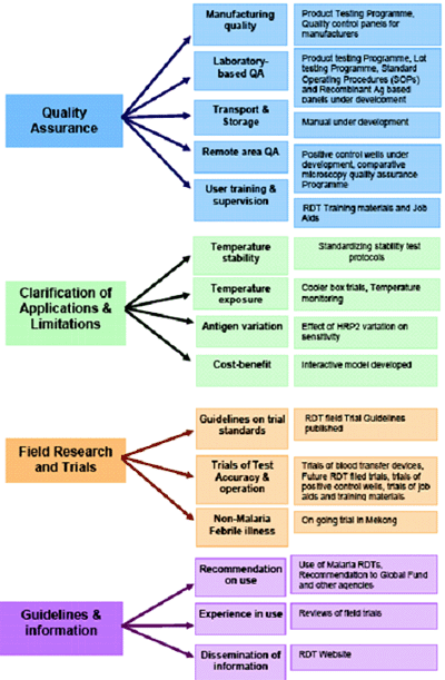 FIND và WHO làm việc cùng với các đối tác, bao gồm các Viện Sinh phẩm quốc gia (National Bioproducts Institute) ở Nam Phi và Bệnh viện bệnh nhiệt đới ở Anh để phát triển các giếng chứng ổn định chứa các kháng nguyên đích chính quan trọng của các test RDTs hiện đang có trên thị trường. Khi có sẵn, sẽ dễ dàng cung ứng và thực hiện các phương pháp kiểm tra, đánh giá test với chi phí thấp, nhằm đảm bảo chất lượng từ khâu xuất phát điểm từ nhà sản xuất đến tay người tiêu dùng, yếu tố sống còn cho chương trình sử dụng test chẩn đoán nhanh tập trung cao nhất là làm thế nào hạ thấp tỷ lệ tử vong do sốt rét. Chuyển giao kỹ thuật này đến một nhà sản xuất là phải có kế hoạch và được đánh giá tại thực địa quy mô lớn tất cả từ cuối năm 2008.