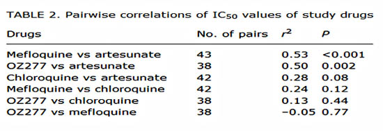 Có mối tương quan thuận có ý nghĩa trong các giá trị IC50 của OZ277 với tất cả các thuốc khác, ngoại trừ CQ. Tương quan giữa OZ277 và AS là r = 0.78 (p < 0.001) ở Tanzania và r = 0.45 (p = 0.006) tại Colombia và giữa OZ277 và MQ là r = 0.48 (p = 0.001) tại Tanzania và r = 0.62 (p < 0.001) tại Colombia. Tương quan giữa OZ277 và AS không đáng ngạc nhiên vì cả hai phân tử đều là peroxide, do vậy chúng có thể cùng chung một cơ chế tác động.