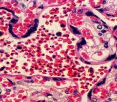 Nhau thai nhiễm KSTSR, khoảng không giữa các mao rau thai được lấp đầy bởi các tế bào hồng cầu, chủ yếu nhiễm loạiP.falciparum. Nhau bị nhiễm KSTSR không duy trì chức năng bình thường để cung cấp vi chất dinh dưỡng cho thai. | Nhau thai nhiễm KSTSR bi lấp đầy hồng cầu và ký sinh trùng gây tắc nghẽn vi mạch máu à suy thai và một số hậu quả nghiêm trọng khác |