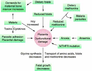 -Giả thuyết 4: cơ địa người phụ nữ mang thai cho thấy có những sai số liên quan đến type- 2 cytokines nên nhạy cảm với các bệnh đòi hỏi đáp ứng type 1 giống như của bệnh lao, sốt rét vàleishmaniasis,…Tuy nhiên, ở những PNMT nhiễm bệnh có sự thay đổi cân bằng giữa môi trường nhau thai tại chỗ từ Th2 với Th1, phù hợp với lượng lớn tế bào mono trong bánh nhau bị nhiễm. Nồng độ IL-10 giảm, trong khi các yếu tố interferon IFN-gama, interleukine IL-2, chỉ điểm yếu tố hoại tử mô TNF-α cho đáp ứng type-1 Cytokine tăng lên. Các cytokines tiền viêm này giúp giải thích cho cơ chế bệnh học sốt rét ở PNMT. Nồng độ TNF-αtăng có liên quan đến thiếu máu nặng ở người mẹ; triệu chứng học của sốt rét và tăng cytokine tại chỗ góp phần cho hậu quả và tiên lượng nặng đến người PNMT.